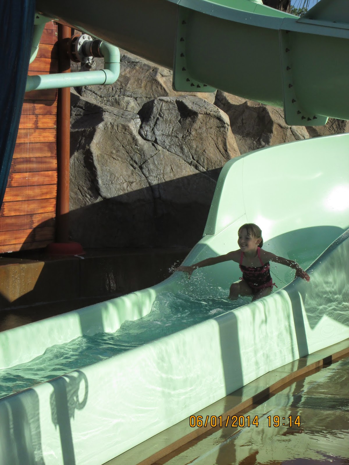 We stayed at the Howard Johnson Hotel in Anaheim. It had a little water park for the kids to play at. The girls & Johnny had a blast waiting for the water bucket to dump and for the little water slide they could slide down.